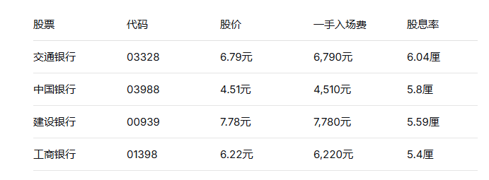 大型内银股是港股高股息的代表,股息率普遍在5厘以上,部分接近6厘。这类股票的特点是估值低、波动相对较小,且一手入场费大多在万元以下,门槛较低。